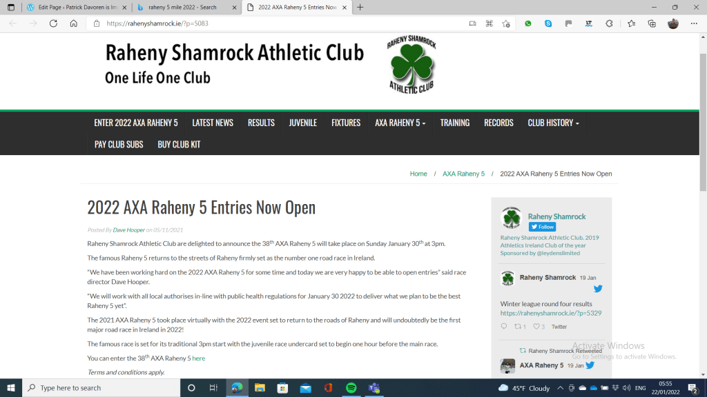 The 2022 Raheny Shamrock AC 5 miler takes place on 30th January, 3.30pm. A brilliant race to target, to start the year off with a possible personal best. Entries are now open. Bring the family as children races take place from 1.30pm, so everyone can participate and enjoy a great day running. https://rahenyshamrock.ie/?p=5083